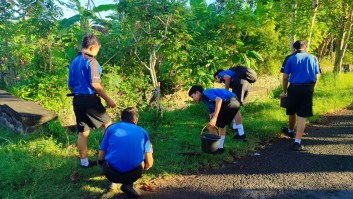 dibagi menjadi dua agenda. Sebagian bertugas membersihkan lingkungan sekolah, termasuk taman, halaman, dan ruang kelas. Sementara itu, kelompok kedua menuju Pura Puseh Dauhwaru untuk melaksanakan pembersihan di areal pura
